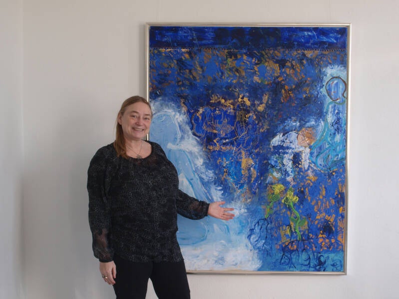 Lotte Kjoeller in front of her sold painting in SAK Exhibitionhall, Svendborg, Denmark 2017.